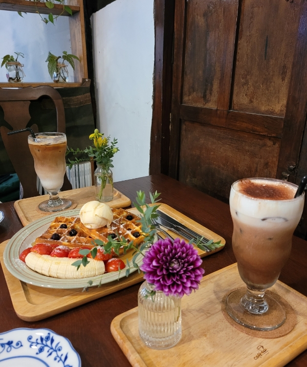 와플은 바삭하면서도 부드럽게 씹히는 식감이 좋았고, 달콤한 토핑과 함께 커피와 잘 어울렸습니다.