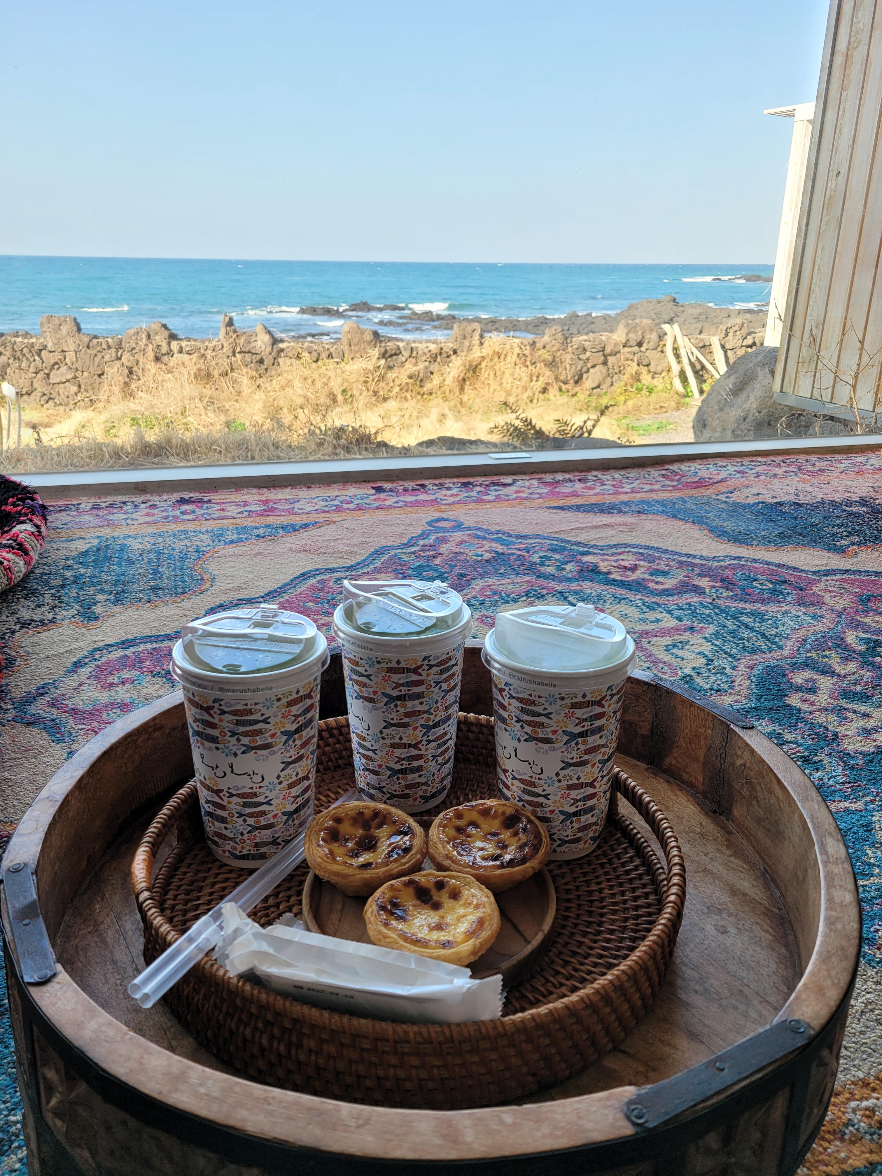 모알보알의 진정한 하이라이트는 역시 압도적인 '오션뷰'예요. 제주 구좌해안로에 위치해 있어 , 실내 어느 좌석에 앉아도 드넓은 제주 바다가 한눈에 시원하게 들어온답니다. 하지만 이곳의 진가는 야외 테라스에서 빛을 발해요.